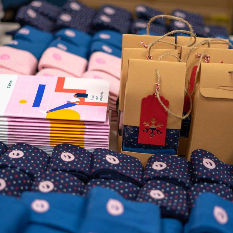 Para poder colaborar con el proyecto de FUNDAP, decidimos diseñar tres pares de calcetines con el objetivo de venderlos y destinar los beneficios obtenidos al proyecto de Becas para la Niña de FUNDAP. Cada calcetín tenía un diseño único y diferente, así como un packaging específico dependiendo de si los interesados elegían un par de calcetines, se decantaban por el Pack de tres o elegían el SúperPack de seis, pensados para regalar en estas fechas tan señaladas. Además, como obsequio para aquellos que eligieron el Pack o el SúperPack, diseñamos una libreta y un calendario de Calmo Agency.